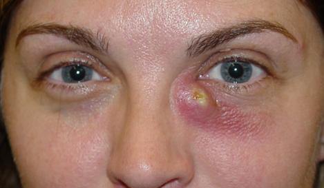 Дакриоцистит — это воспаление слезного мешка, который находится между носом и внутренним углом век. Обычно он возникает из-за нарушения проходимости носослезного протока, который проводит слезную жидкость в носовую полость. В мешке развивается воспаление. Мешок сильно растягивается, становится заметным под истонченной кожей бокового ската носа и угла глаза.